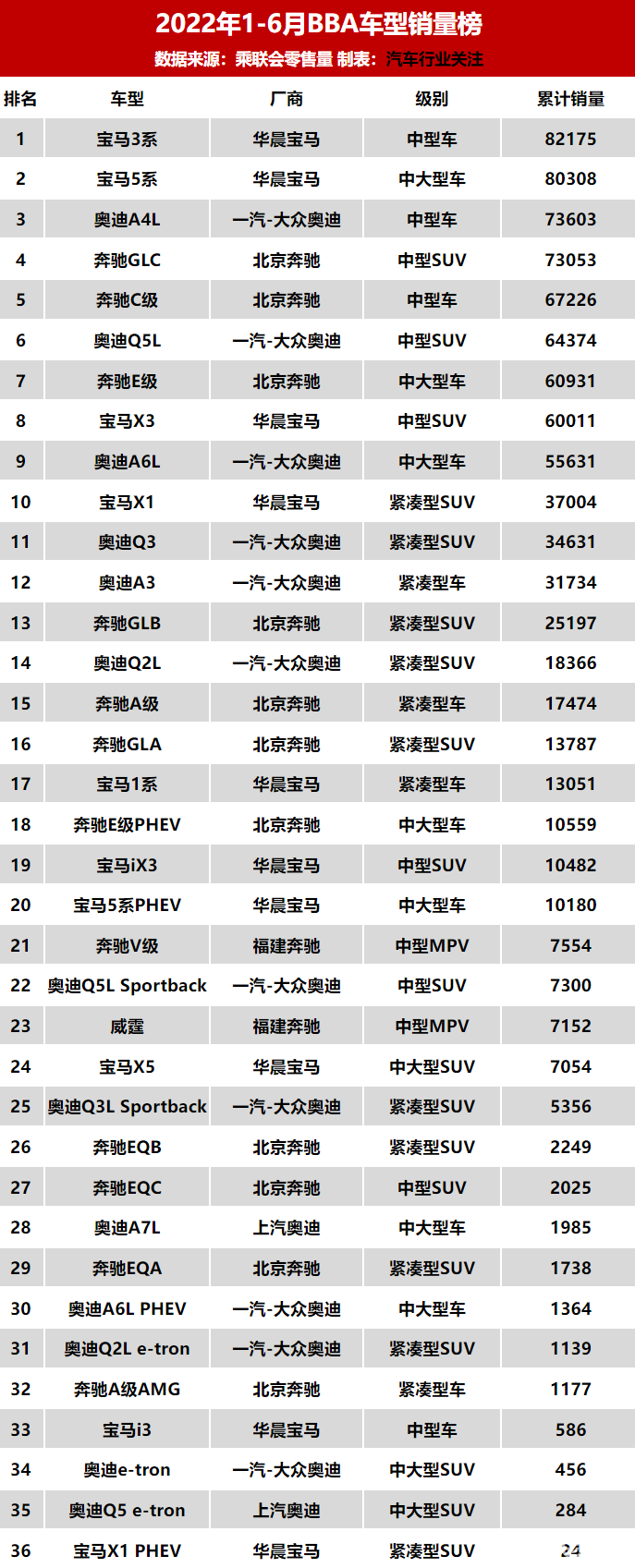 从三家车企公布的国内销量数据来看,宝马累计销量同比下滑23.3%至37.87万辆,是BBA品牌中销量跌幅最小的品牌;奔驰上半年累计销量为35.58万辆,同比下滑24.1%;奥迪排名第三,上半年累计销量同比下滑31.9%至31.70万辆,为BBA品牌中跌幅最高的品牌。