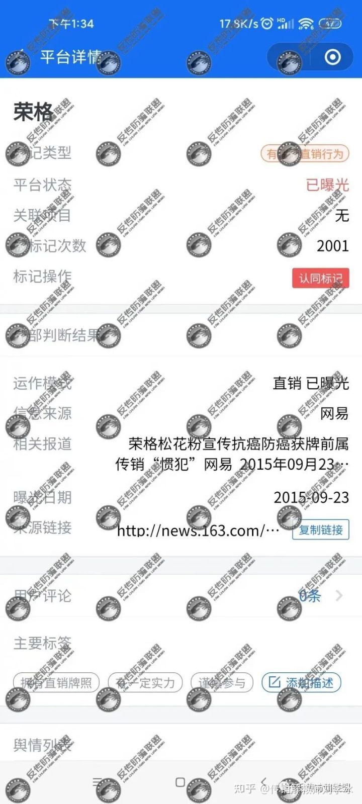 据腾讯平台的灵鲲金融风险查询举报中心显示,荣格的标记类型为“有违规直销行为”,标记次数达2001次,平台状态为“已曝光”状态,早在2015年9月就已有过“荣格涉嫌传销”的相关报道,主要标签有“谨慎参与”等字样。