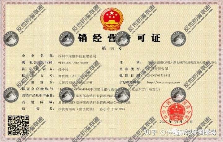 据商务部直销行业管理官网显示,深圳市荣格科技有限公司于2013年3月14日拿到直销牌照,旗下有1个分支机构、8个服务网点,直销产品33种,直销培训员2人。