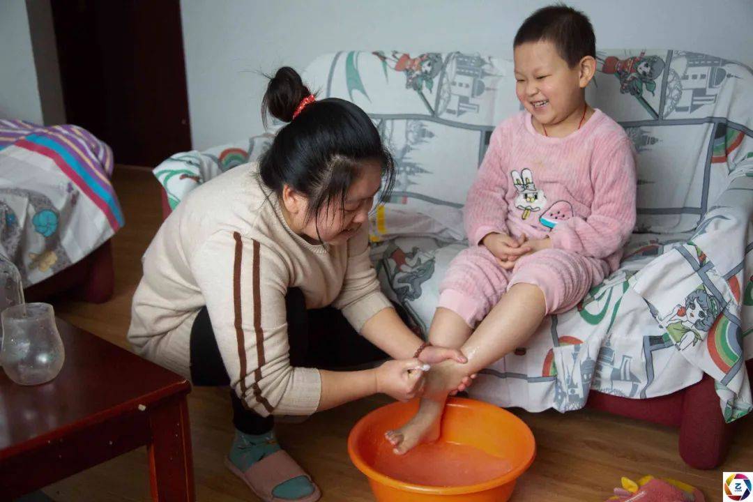 黄彪父亲知道大孙女得了白血病,恨自己没有用,只能躺在床上拖累家人,于是自行停了昂贵的治疗药物,想把钱留给孙女治病。老人每日只能躺在老家一张床上,下半身缠满绷带,睁眼是斑驳的天花板,什么都不能做。黄彪看着父亲这般,心痛难当:“父亲的手术也没钱做了,女儿的病也花钱巨大,我实在不知道怎么办了,顾得了这头,顾不了那头。”图为妈妈照顾芳洁。