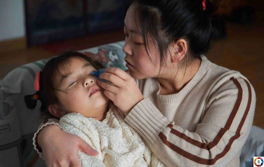 2021年6月13日,黄彪的小女儿一觉睡醒之后右眼肿得特别严重,黄彪立马感觉有一种不祥的预感,果不其然,经山西省某眼科医院检查,小女儿被确诊右眼患视网膜母细胞瘤,即恶性肿瘤。拿到确诊报告的那一刻,黄彪甚至产生了轻生的念头,父亲重伤、大女儿白血病、小女儿确诊肿瘤,他感觉上天似乎跟他开了一个莫大的玩笑。图为黄彪妻子给小女儿上眼药。