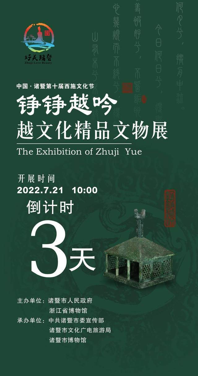 为配合诸暨博物馆基本陈列,特别策划推出了“铮铮越吟——越文化精品文物展”。原创临展由诸暨市人民政府、浙江省博物馆主办,中共诸暨市委宣传部、诸暨市文化广电旅游局、诸暨市博物馆承办,作为2022中国·诸暨第十届西施文化节的重要活动之一,将于2022年7月21日-10月7日在诸暨市博物馆开展。