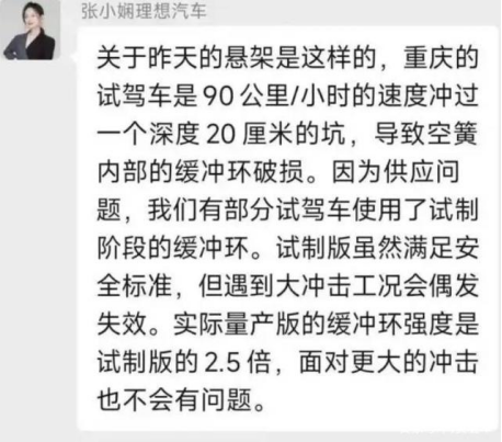 对于这个问题,理想汽车的张小娴则回应,重庆的试驾车是在90公里/小时的速度冲过了一个20厘米的坑,导致空簧内部的缓冲环破损。而且还说实际量产车型的缓冲环强度是试制版的2.5倍,面对更大的冲击,也不会有问题。