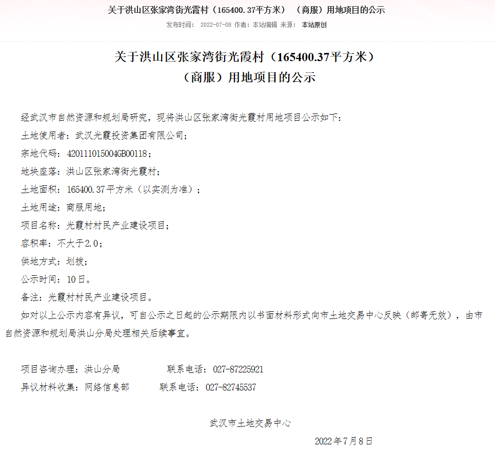 7月8日,武汉自然资源管理局对张家湾街光霞村产业用地进行了公示,该项目名为光霞村村民产业建设项目,土地用途为商服用地,土地面积为165400.37平方米。