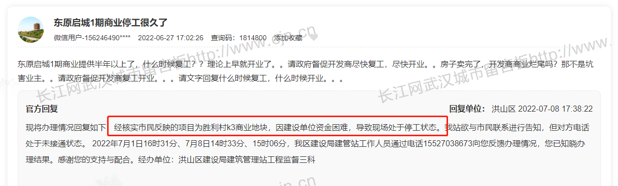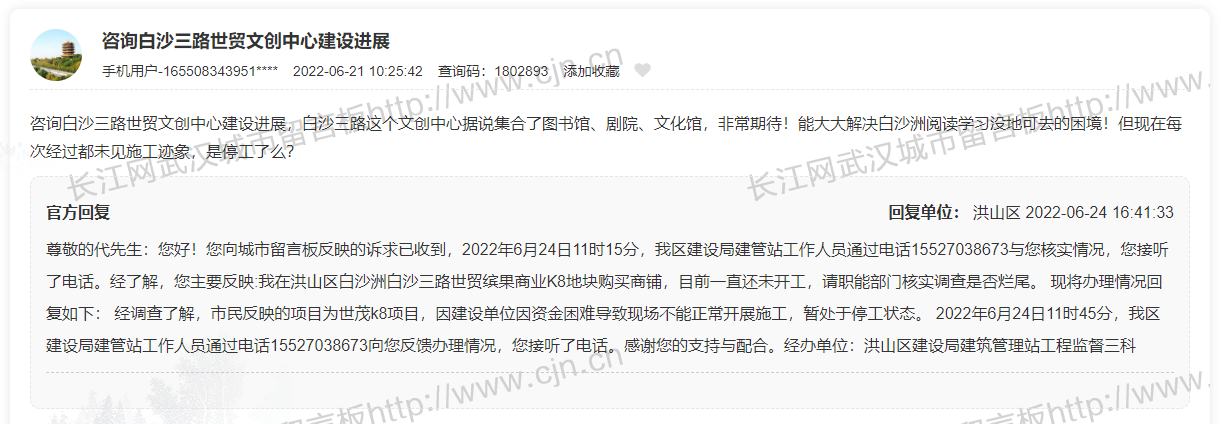 6月底,有网友在武汉城市留言板上咨询,世茂文创中心的建设进展,表示经过项目多次,却未见施工迹象,是停工了吗?洪山区回复:经调查了解,世茂k8项目因建设单位因资金困难导致现场不能正常开展施工,暂处于停工状态。