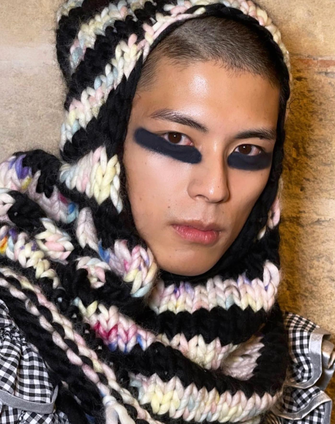 这是一场主打前卫风格的大秀,秀场上的风格非常酷炫颠覆和创新,Aaron Cho 在眼下涂上了黑色的油彩,显得格外前卫。