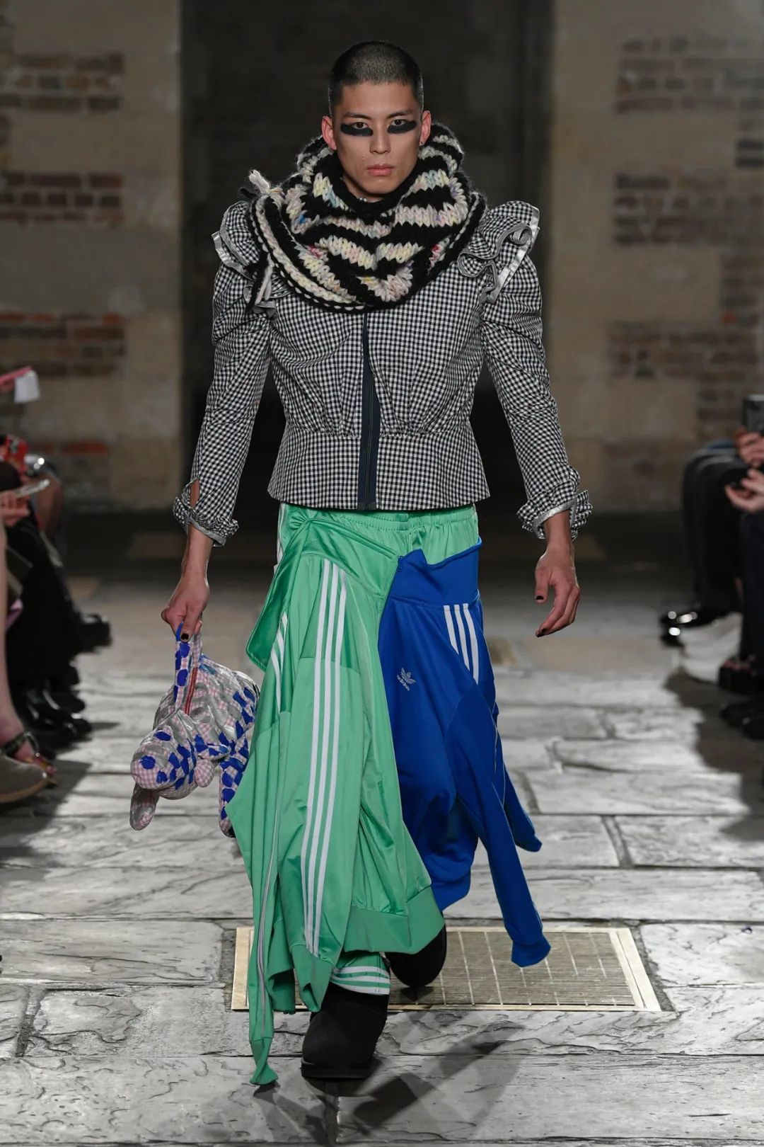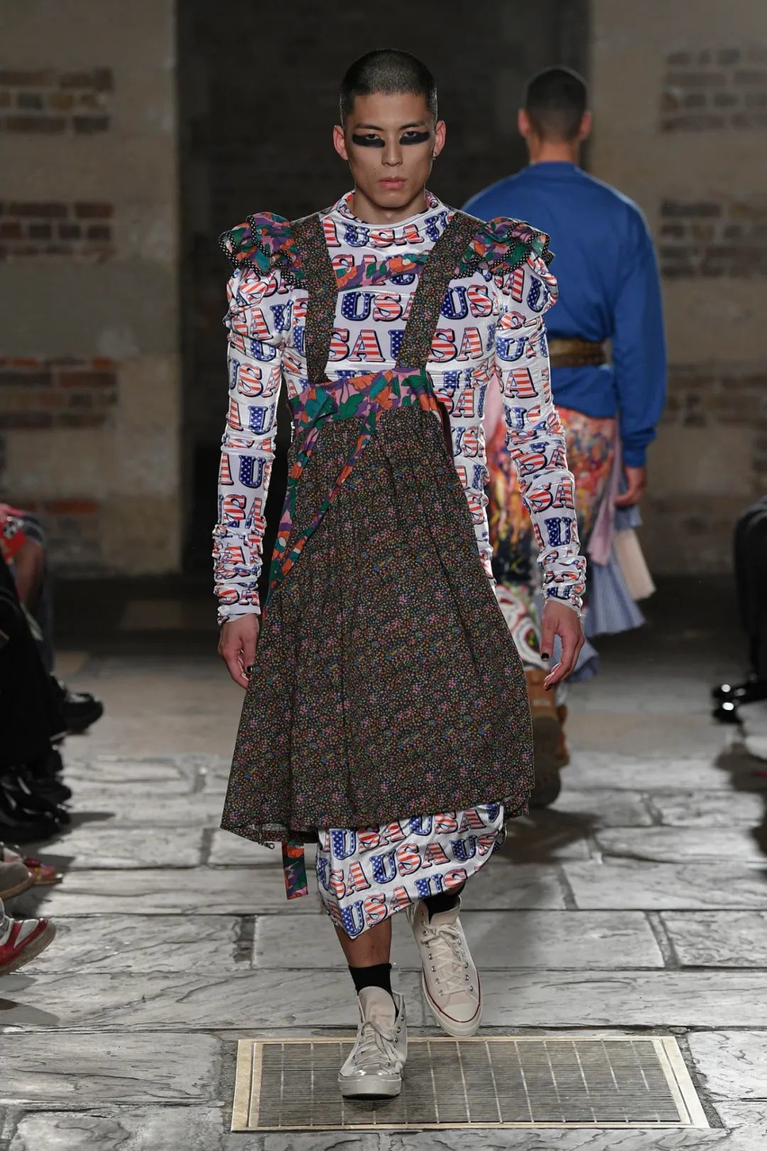 作为一名英国人,Aaron Cho 上一季度在伦敦时装周成名,他在伦敦时装周的 MATTY BOVAN 大秀上挑战了两个颠覆造型,非常吸睛。