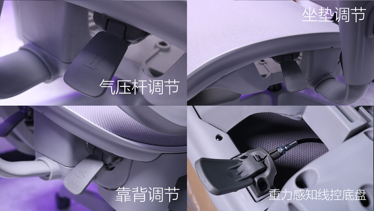 通过这么多的功能调节,我们不难发现这款椅子的亮点在于整个椅子的调节都可以坐在上面进行调节,档位调节和身体舒适度是同时感受的。
