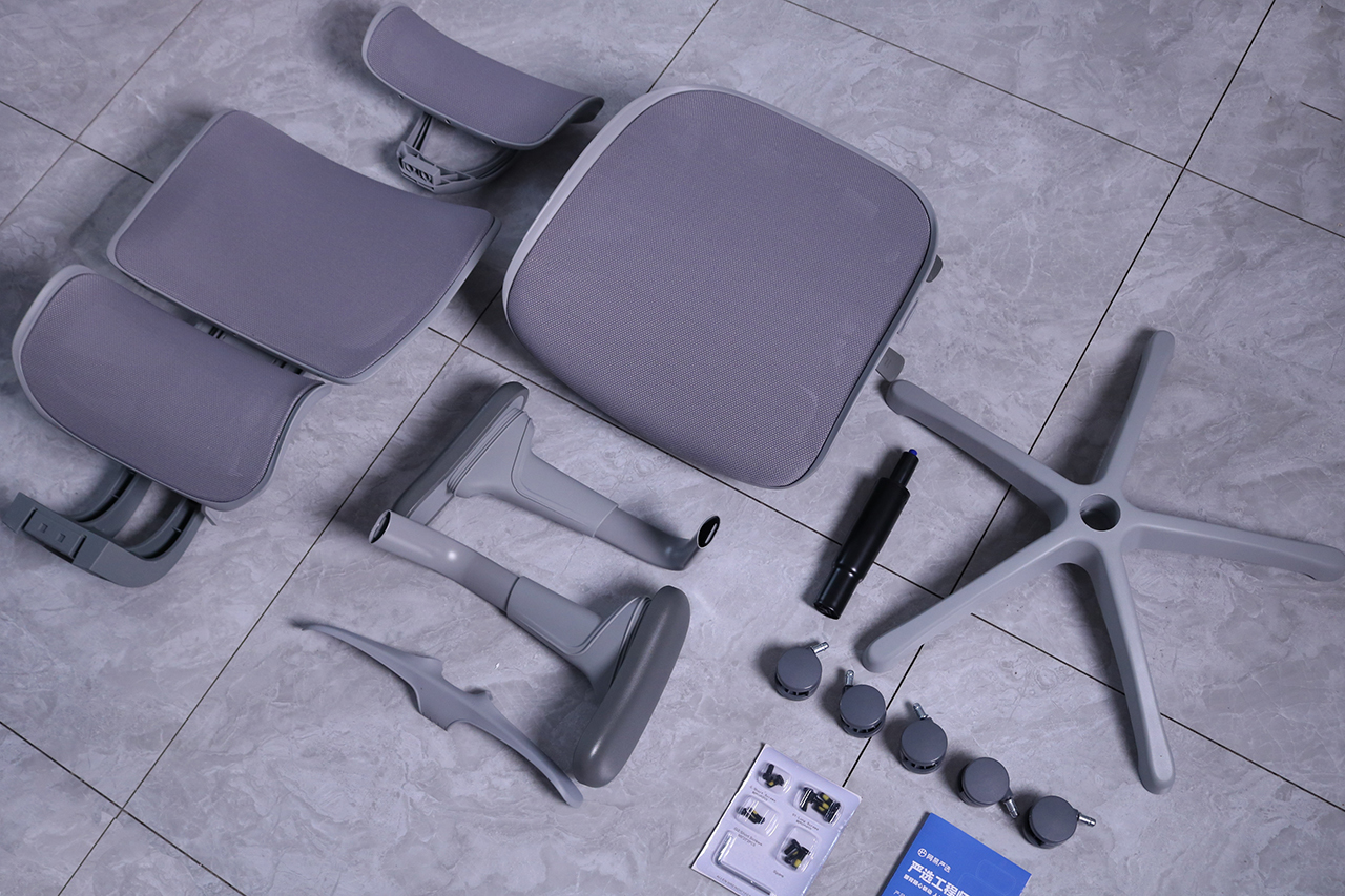打开包装之后每个组件都比较完整,头靠、背靠、坐垫、扶手、衣架、滚轮、气压杆、安装工具,所以说我们安装的并不复杂。