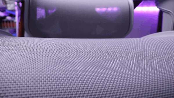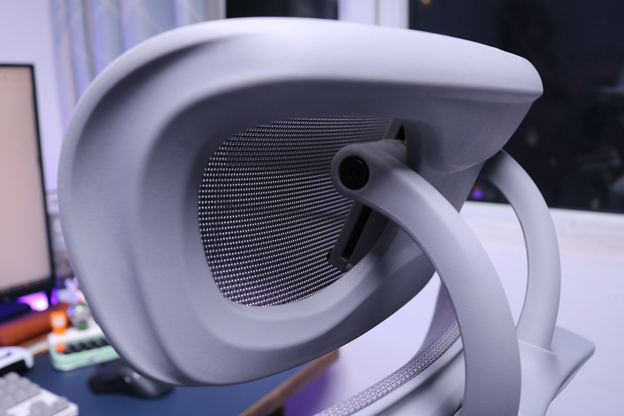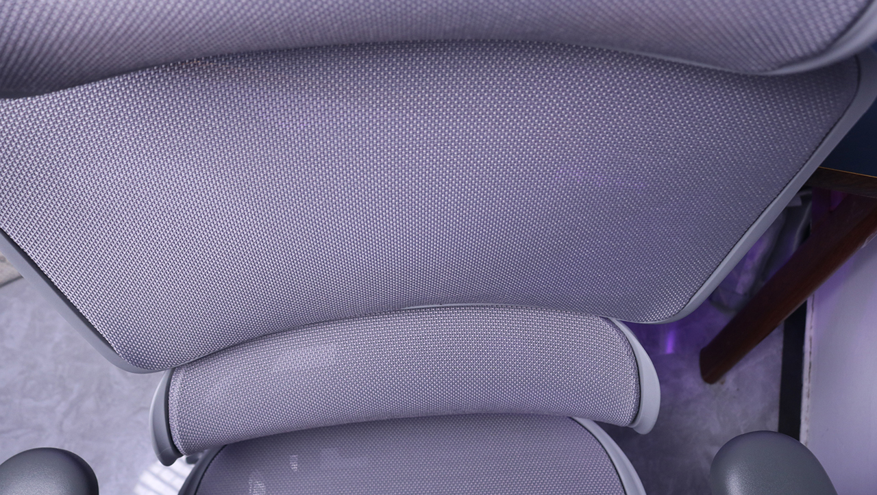 头枕、背部以及坐垫的网布都是采用曲面弧度的设计,头枕及腰靠外翻,背部倚靠内翻,贴合感更好。