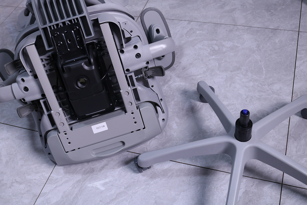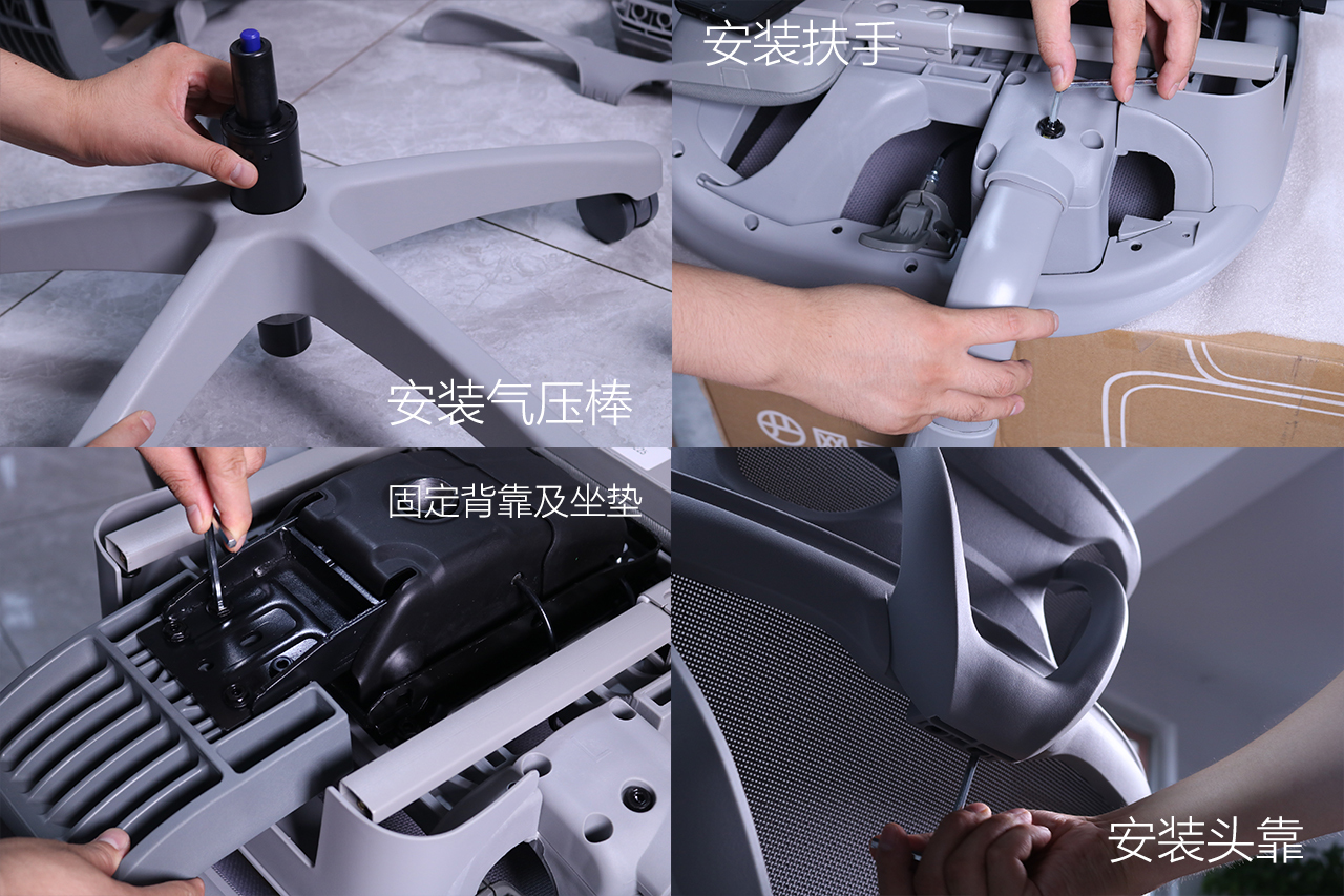 气压棒蓝色向上安装,单个螺丝固定两侧扶手;四颗螺丝连接背靠以及坐垫;两颗螺丝固定头靠。
