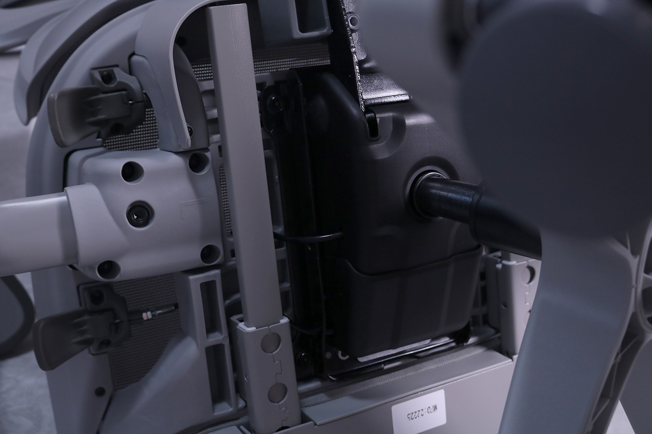 除了腰背四轴联动功能,腰靠也可以进行调后两档强弱的调节。在这里它的调节就涉及到了线控手动调节,类似于自行车手刹的连接。
