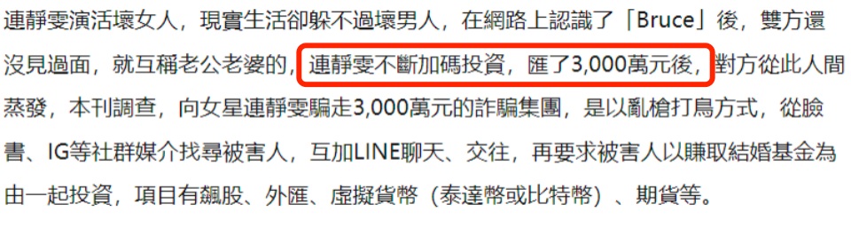然而此次连静雯网恋被骗属实是令人大吃一惊,钱财与感情双失,可谓是血本无归。在娱乐圈和商界打拼多年的连静雯会如此毫无防备地汇款,这样一位独立的女性都会落入“网恋杀猪盘”,这种诈骗集团的手段可见一斑。