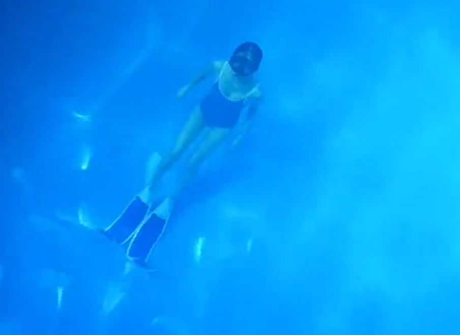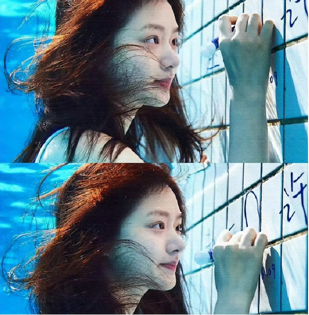 此后任敏还摘下了护目镜潜到了水里,只见她飘逸的长发随着水流的涌动四散开来,一双灵动的眼睛专注地盯着自己正在墙上写的字,周围的小水泡好似珍珠般在她周围点缀着,任敏整个人有种清水出芙蓉的美。