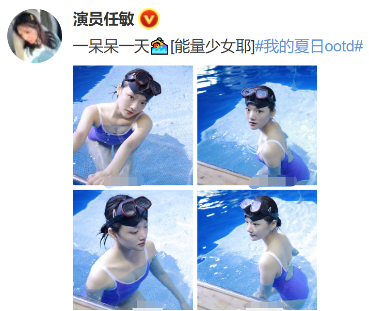 近日,知名演员任敏在自己的个人社交平台上和大家分享了一组在泳池游泳的照片,任敏还配文说:“一呆呆一天”,她还自封自己为能量少女,在泳池里的任敏全程素颜,一脸的清纯与活力满满。
