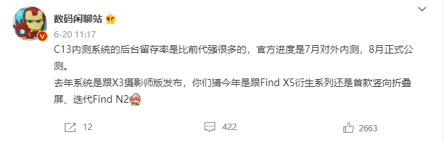 此外,@数码闲聊站 还多次强调,ColorOS 13系统的后台留存率相较于前一代系统提升明显,即大幅度改善了“杀后台”问题。目前,ColorOS 13系统的后台留存率如何我们还不清楚,但在ColorOS 12上,“杀后台”情况确实变少了。根据OPPO软件技术规划负责人洪汉生透露,目前搭载了ColorOS 12.1系统的OPPO Find X5 Pro,后台留存率高达95%。