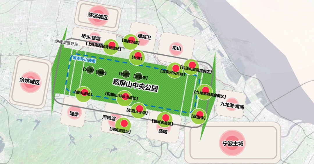 翠屏山位于宁波主副双城之间,中央公园面积约420平方公里,涉及镇海区、江北区、余姚市和慈溪市。今后,翠屏山片区作为宁波现代化滨海大都市的中央公园,目标是“打造具有世界影响力的大遗址文化传承地、彰显现代化滨海大都市独特魅力的文旅融合区”。