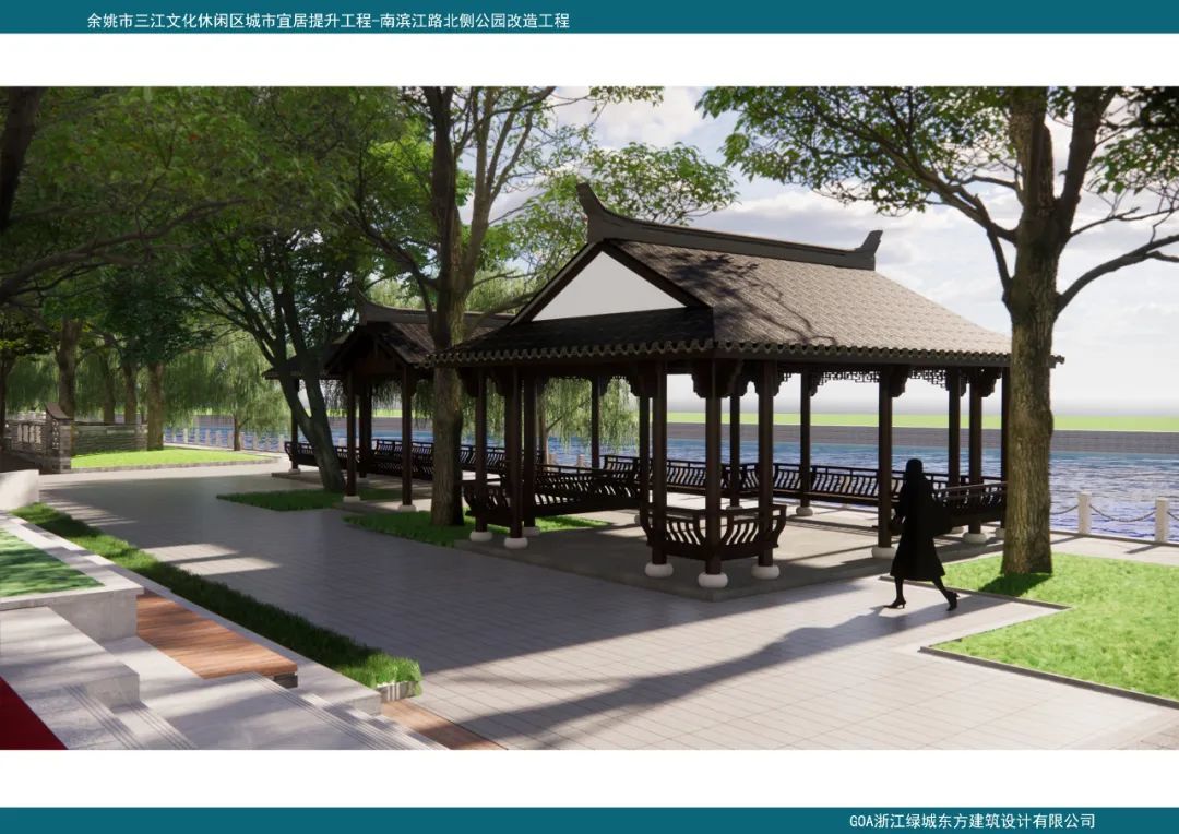 滨江公园改造工程范围北临姚江,南靠南滨江路,西起通济桥,东至念慈桥,由景观改造和照明改造两部分内容组成,具体为新建景墙组合、廊亭、休息观景平台等,改造停车位和绿道;