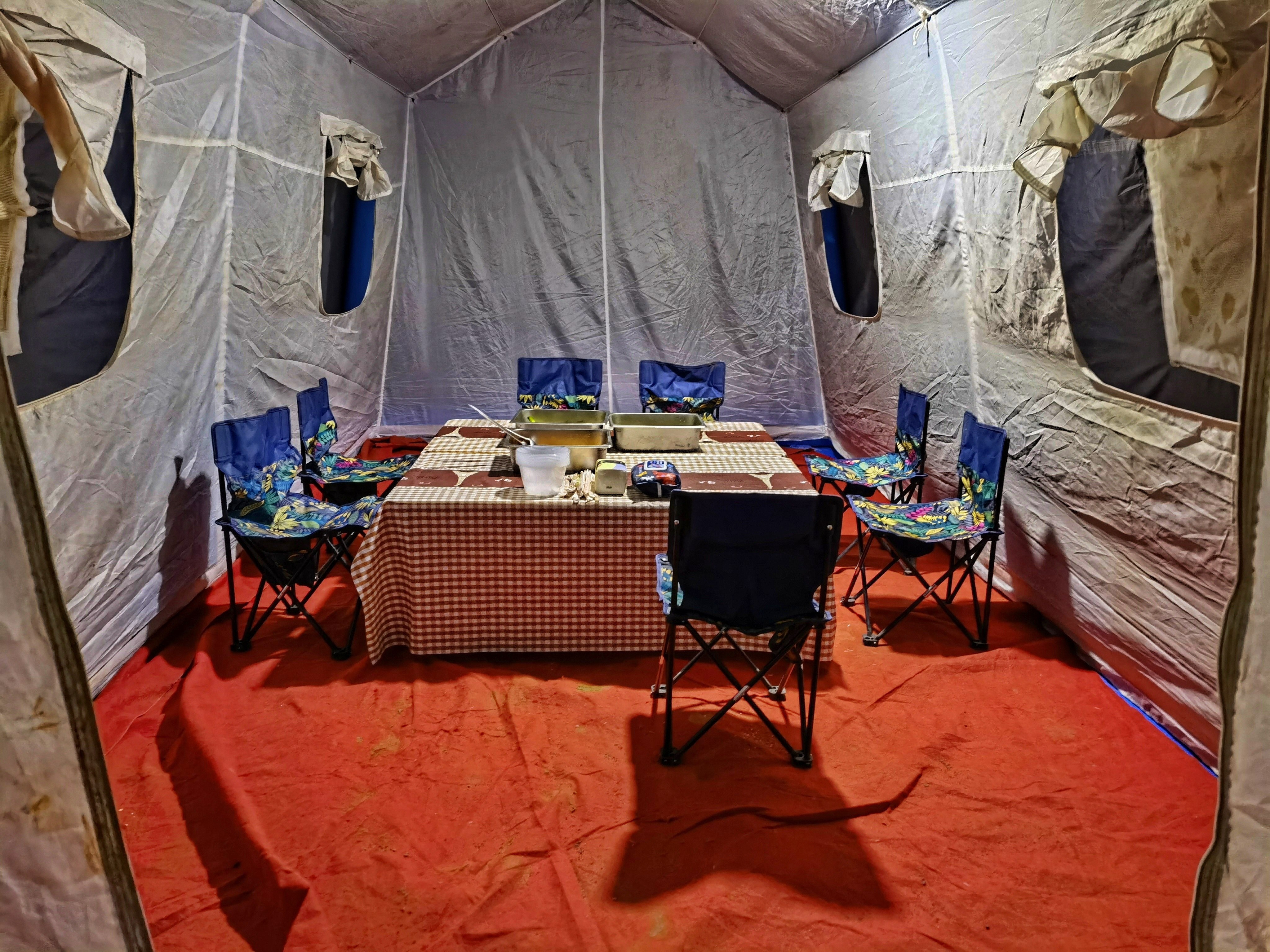露营的第一天,我们集中住宿在充气大帐篷中,钻进温暖的睡袋,成为一颗颗“茧”,炉火烧得正旺,这些“茧”疲惫地睡去。
