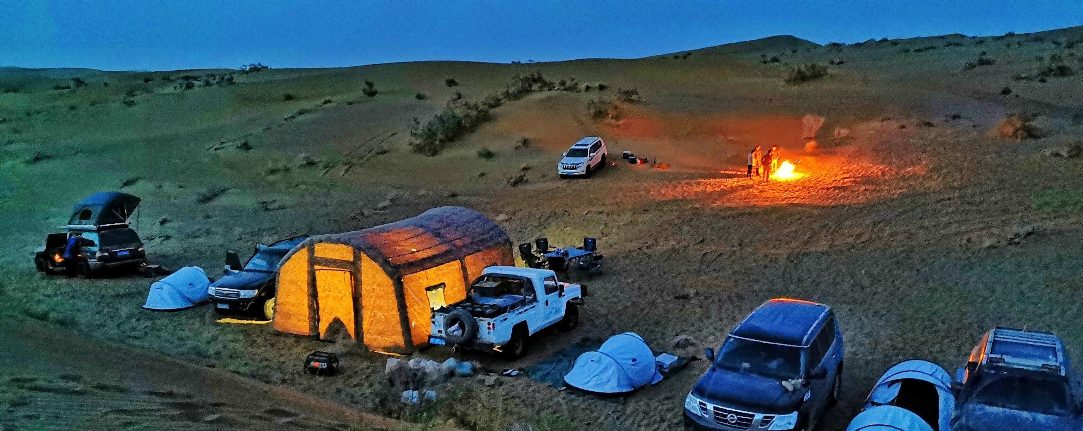 饭后大家一起收拾物资,打算开拔,闲来无聊的自驾老大哥把一次性筷子投入炉子中,之后一发不可收拾,塑料袋、纸巾,只要手边能找到的,无用的垃圾归宿地都变成了火炉。一个燃烧的塑料袋顺着烟囱往上飘啊飘,优雅地落在帐篷上,在燃尽的那一刻爆发出令人惊叹的生命力。“帐篷着了”,不知道谁喊了一声,厨师去取水,刷了一半牙的队员把水杯里的水奉献出来,还有人就地取材,扬起一把又一把的黄沙。一大早上,沙漠中便上演了“冰与火”之歌。