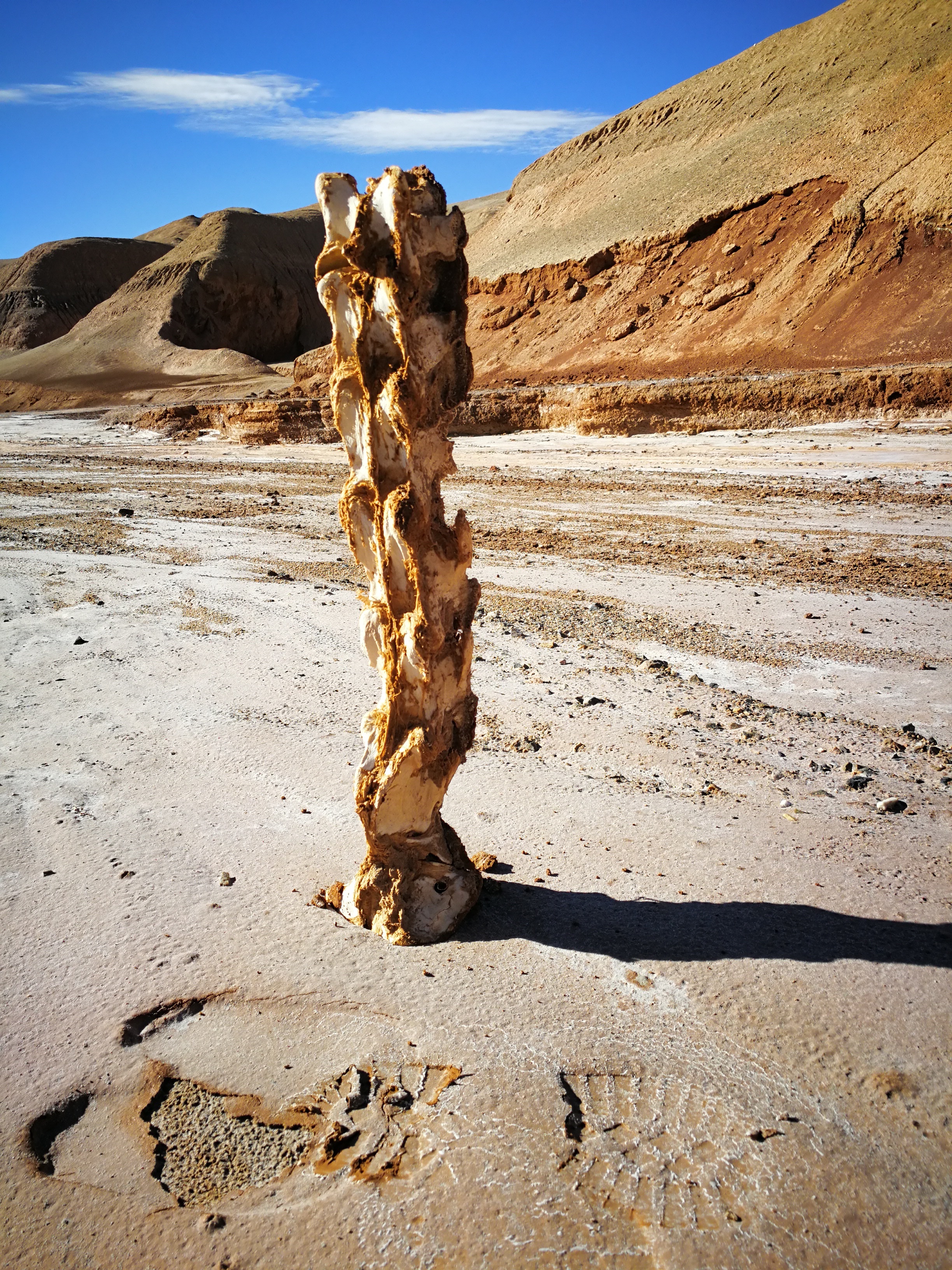 刚开始还是新奇的,想着这里不是沙漠吗?为什么有这么多在风中努力挣扎的芦苇?为什么有一个水管,并且里面在源源不断地流出清澈的水?为什么地上还有清晰可见的车辙印记。随着领队的讲解,我开始理性地认知罗布泊。