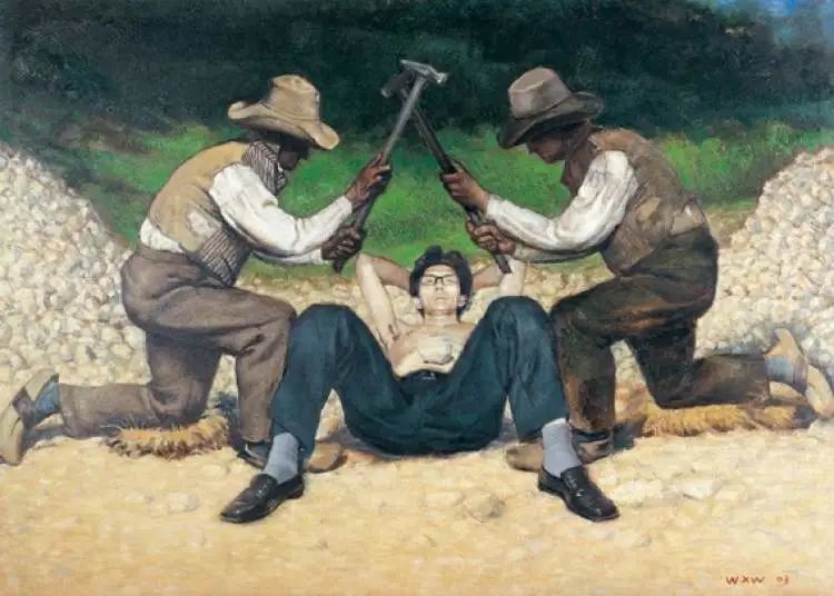 《无题(打石工)》中虽然运用了19世纪库尔贝《打石工》的形象,但王兴伟将中间的被打对象换成了自己,有种胸口碎大石的意味。