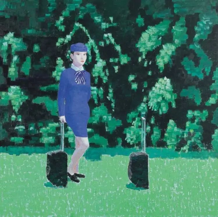 王兴伟,《无题(空姐和拉杆箱)》,布面油画,