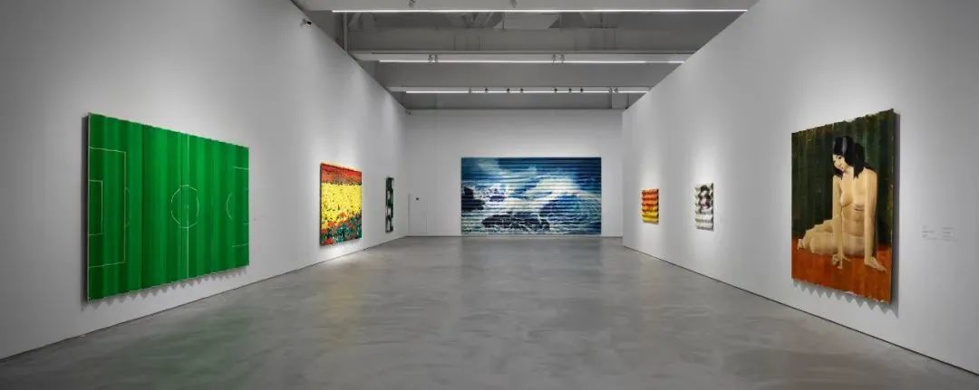 这时期,王兴伟没有去构思一个新形象,而是全部采用现成图像。最早,王兴伟将瓦楞板与画布结合,后将瓦楞板作为画布,利用材料的曲面,使花海、海潮、倒影、足球场等描绘对象得以获得一种异变的荒谬感。