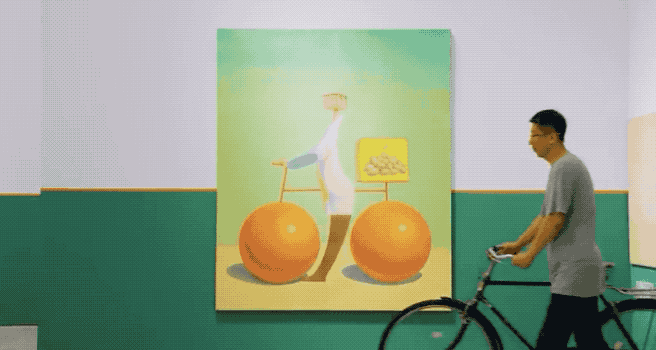 《无题(大收旧电脑)》是这一系列中最大尺幅作品,类似文艺复兴早期,贵族骑马的纪念碑式绘画。王兴伟根据古典绘画的形式,创造了一位翘臀、扶自行车的形象。