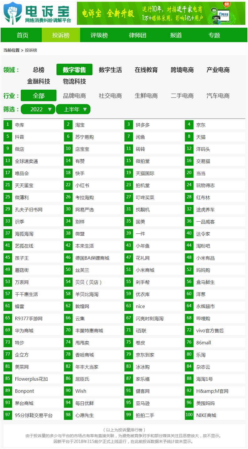 寺库 淘宝 苏宁易购 闲鱼等入投诉榜前十