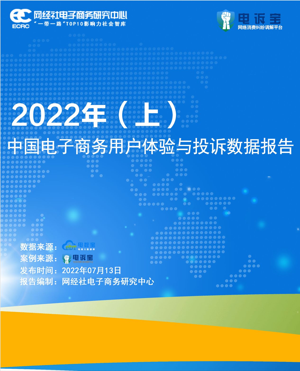 2022年7月13日,依据国内知名网络消费纠纷调解平台“电诉宝”(315.100EC.CN)2022上半年受理的全国224家互联网消费平台纠纷大量案例数据,我国“一带一路”TOP10影响力社会智库网经社电子商务研究中心发布了《2022年(上)中国电子商务用户体验与投诉数据报告》。(报告全文下载:http://www.100ec.cn/zt/2022Stsbg/)