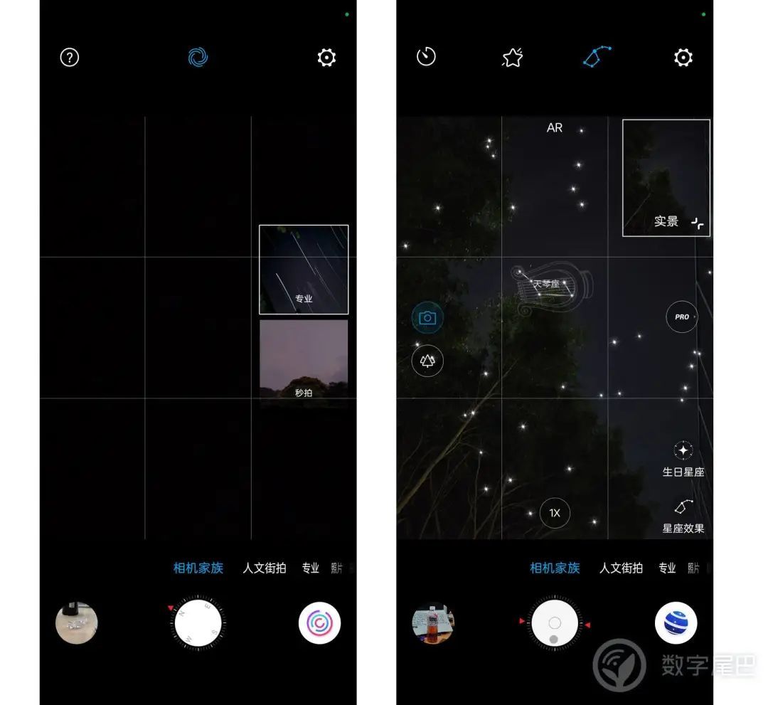 在相机家族里面,我们可以简单通过这些已经预设好的模式实现复杂的拍摄效果。例如经典的星轨和星空模式,除了能够通过长曝光拍摄之外,也有秒拍功能通过 AI 的形式实现星轨照片,甚至星空拍摄里面还有 AR 星座定位,方便用户找到具体的星座位置进行拍摄。