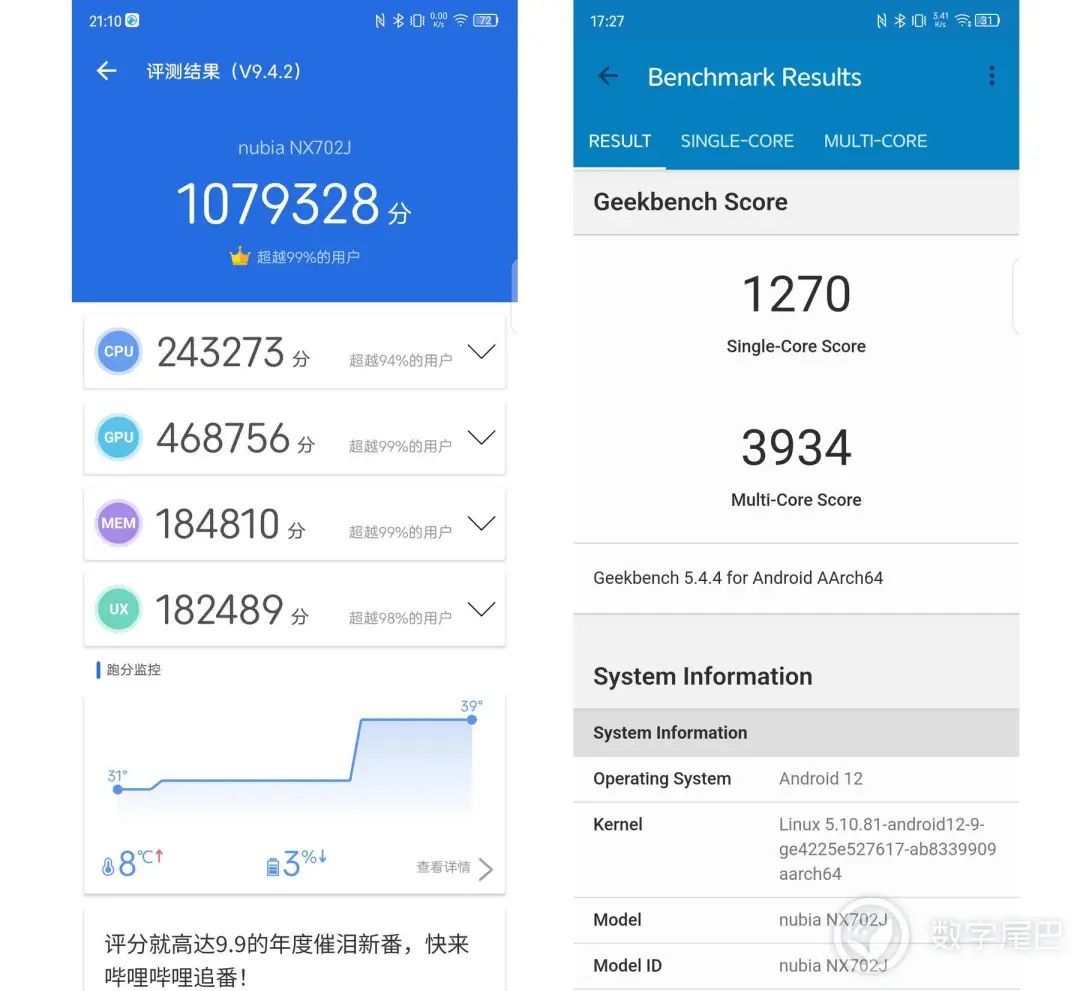 另外比较让人惊喜的就是,这一代的 SoC 性能释放确实不错,很愿意跑,发热的情况相比骁龙 8 也有所改善。首先还是基础的性能测试,最新版安兔兔在室温下连接 WiFi 跑分,轻轻松松达到 1079328 分的好成绩。在 GeekBench 5 中单核得分为 1270 分,多核为 3934 分,与之前我们测试的骁龙 8+ 数据差不多。