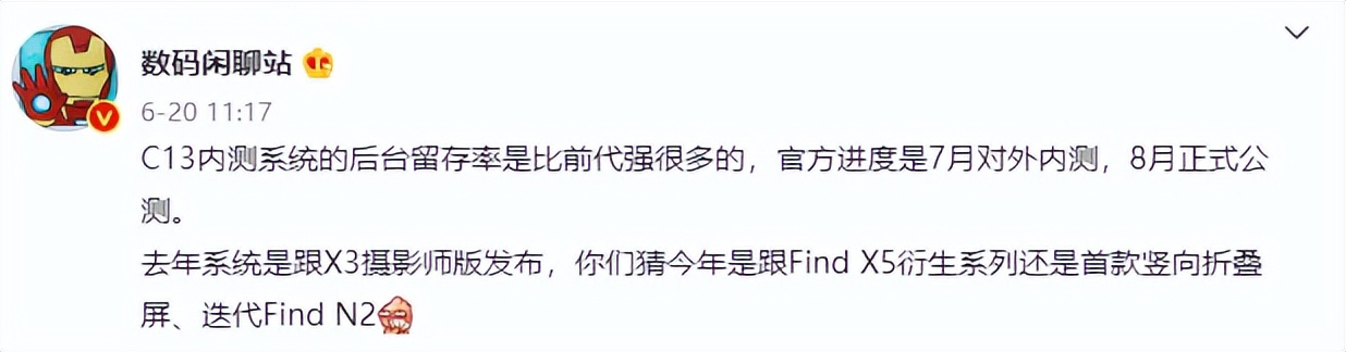 对了,根据@数码闲聊站 透露,ColorOS 13内测系统的后台留存率是比前代强很多的,所以我们猜测新一代的ColorOS系统不仅可能会在流畅度方面再有所提升,在这个基础上还可能会大幅提升后台体验,让流畅度再提高一个台阶。