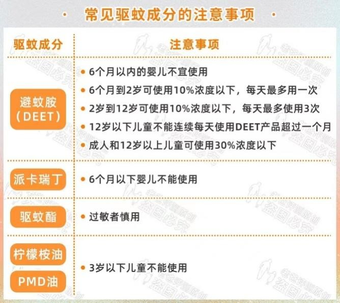 事实上,参照美国环境保护局(EPA)、美国疾病控制与预防中心(CDC)、加拿大卫生部的评估,避蚊胺(DEET)、派卡瑞丁、驱蚊酯(IR3 535)、柠檬桉油、PMD油、甲基壬基酮为有效的驱蚊成分,一般而言浓度越高驱蚊时间越长,没有这几种成分的驱蚊产品其驱蚊效果就要打个问号了。