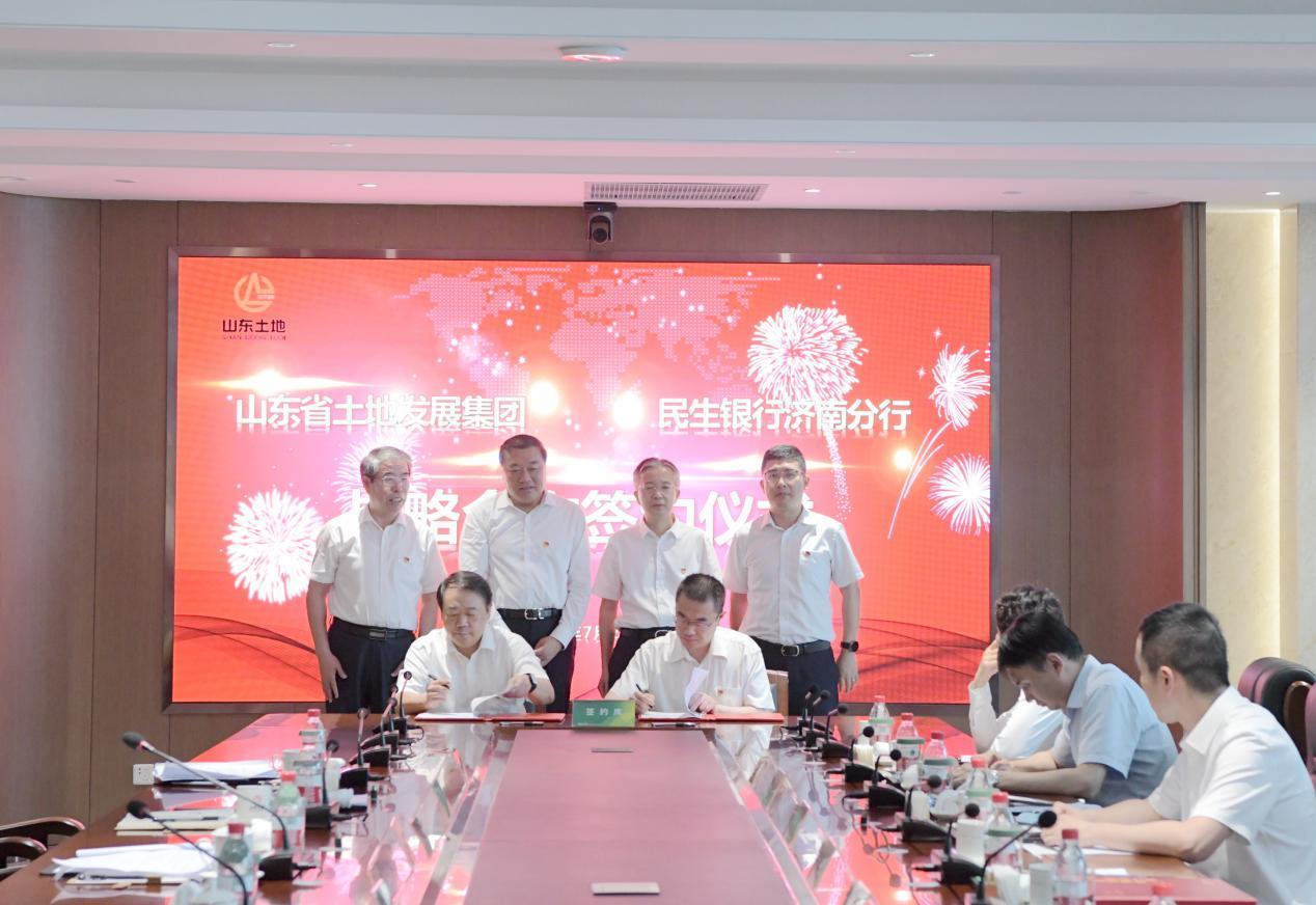 在黄绍辉党委书记和展宝卫董事长的共同见证下,民生银行济南分行与山东土地集团签署战略合作协议,民生银行济南分行副行长马涛与山东土地集团财务总监郭彦光代表双方签署合作协议。