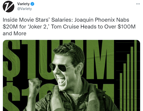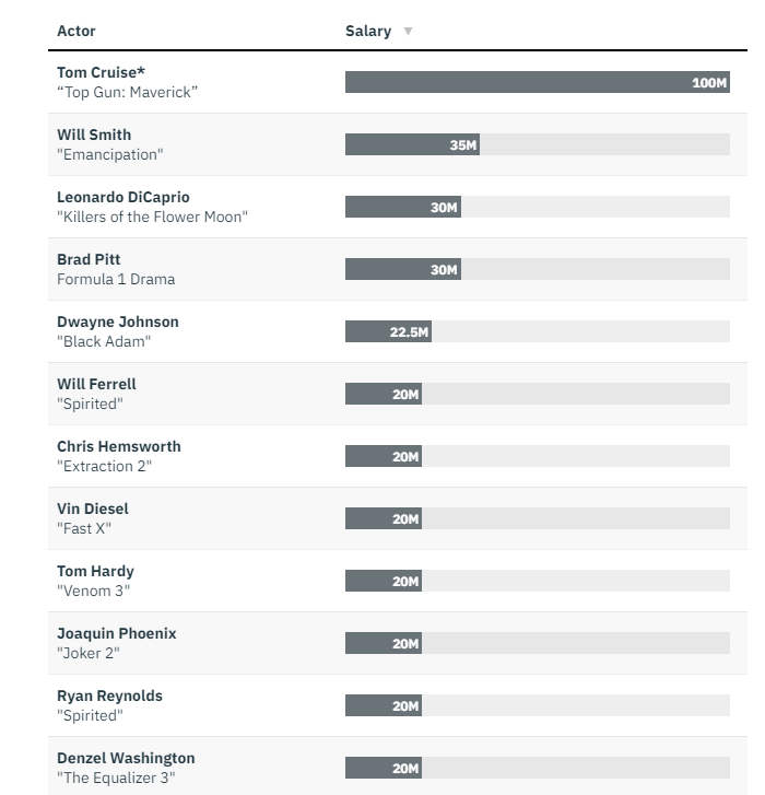 Variety在周三曝光了这份最新名单。榜单上遥遥领先的是汤姆·克鲁斯。以他主演的《壮志凌云2:独行侠》为例,这部电影的全球票房高达约12亿美元,有消息称,克鲁斯将从票房分红、薪酬、流媒体和家庭端播放分红中获得总共1亿美元或更多的收入。