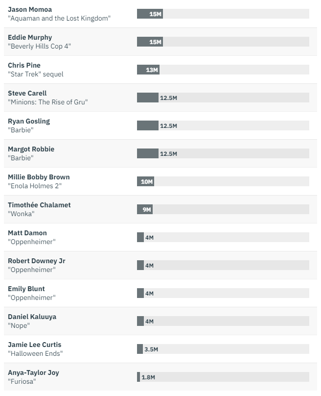 片酬榜前20名中只有一名女演员上榜,玛格特·罗比凭借其主演的新片《芭比》和男主瑞恩·高斯林各拿1250万美元,史蒂夫·卡瑞尔配音《小黄人2》也有1250万美元入账,仨人并列第16名。
