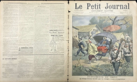 在编辑过程中,我个人印象大致有几点:首先,由于我过去对法语的报刊杂志并不是很熟悉,所以书中这些图片最初对我来说相对比较新鲜,有令人刮目相看的感觉。国内的中文史料中过去似乎也很少有人引用过这些图像资料。第二,所有这些图片全是彩色的,这一点我觉得很不简单。众所周知,制作彩图费时费力,印刷成本更高,对印刷质量的要求也要更高些。彩图不仅在读者的视觉效果上显得更为自然和美观,而且作为史料,它们也包含了更多的历史和文化信息。例如人物的服饰,从皇帝龙袍、李鸿章的黄袍马褂,直至义和团、清军服装和外国官兵的制服等,如果不是彩色的,读者对它们的印象肯定会打折扣。同理,插图中的各种旗帜和建筑如果不是彩色的话,也难以达到理想效果。原本是黑白两色的插图,一旦上色之后,其面貌便焕然一新,给人留下的印象也会更加深刻。伦敦和巴黎我都去过,在我的印象里,法国人似乎比英国人更具艺术细胞,对色彩也更加敏感。罗浮宫和凡尔赛宫的装饰风格就远比大英博物馆和白金汉宫更为奢华和绚丽多彩。我原来对英国教堂的彩绘玻璃和内部装饰印象颇深,但是在参观了巴黎的几个大教堂之后,才知道我所见过的那几个英国大教堂跟巴黎的大教堂相比,在艺术品位上可谓是小巫见大巫。