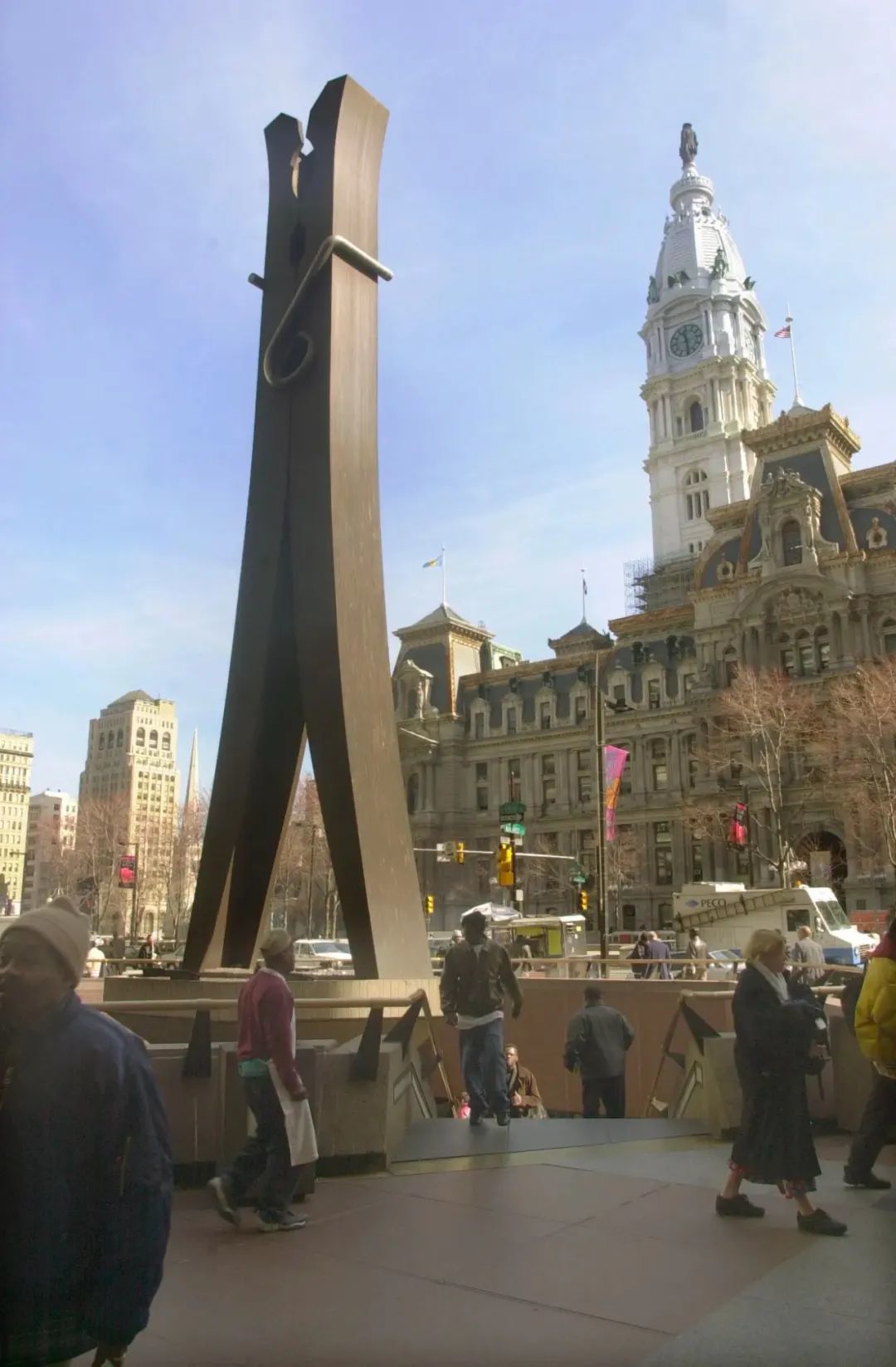 奥登伯格与妻子的第一次合作是1976年,他们在荷兰的库勒-穆勒博物馆(Kröller-Müller Museum)的场地上完成了“泥铲I”(Trowel I)的最终版本。同年,他们创作了最著名的作品“衣夹”(Clothespin),这件作品旨在纪念美国《独立宣言》(Declaration of Independence)两百周年,作品高45英尺,重约10吨,采用黑钢材质,衣夹上的金属弹簧巧妙地采用了数字“7”和“6”的组合,作品与传统的纪念性雕塑形成了鲜明的对比和反差,用一种轻快戏谑的手法挑战了公共雕塑的展示惯例。