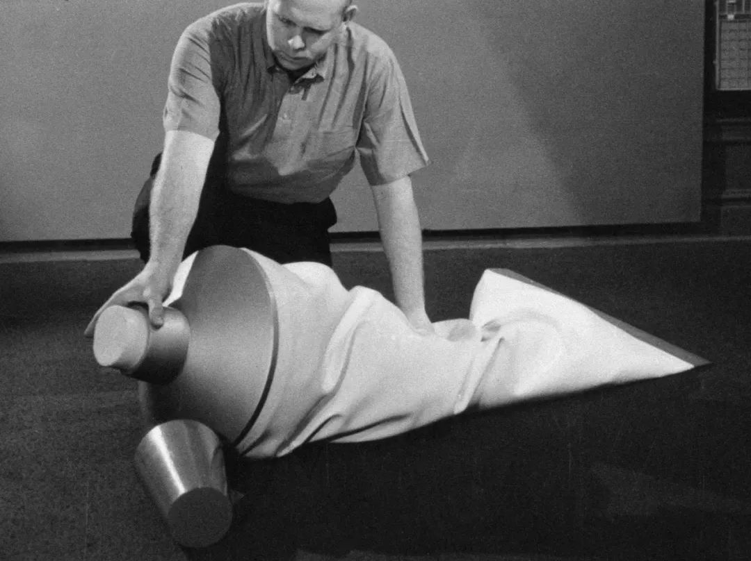 ▲ 艺术家克拉斯·奥登伯格(Claes Oldenburg)与其在欧柏林学院的作品《巨大的三向插头》(Giant Three-Way Plug),1970年;© Claes Oldenburg; photo courtesy Paula Cooper Gallery, New York and Allen Memorial Art Museum, Oberlin College;图源hyperallergic
