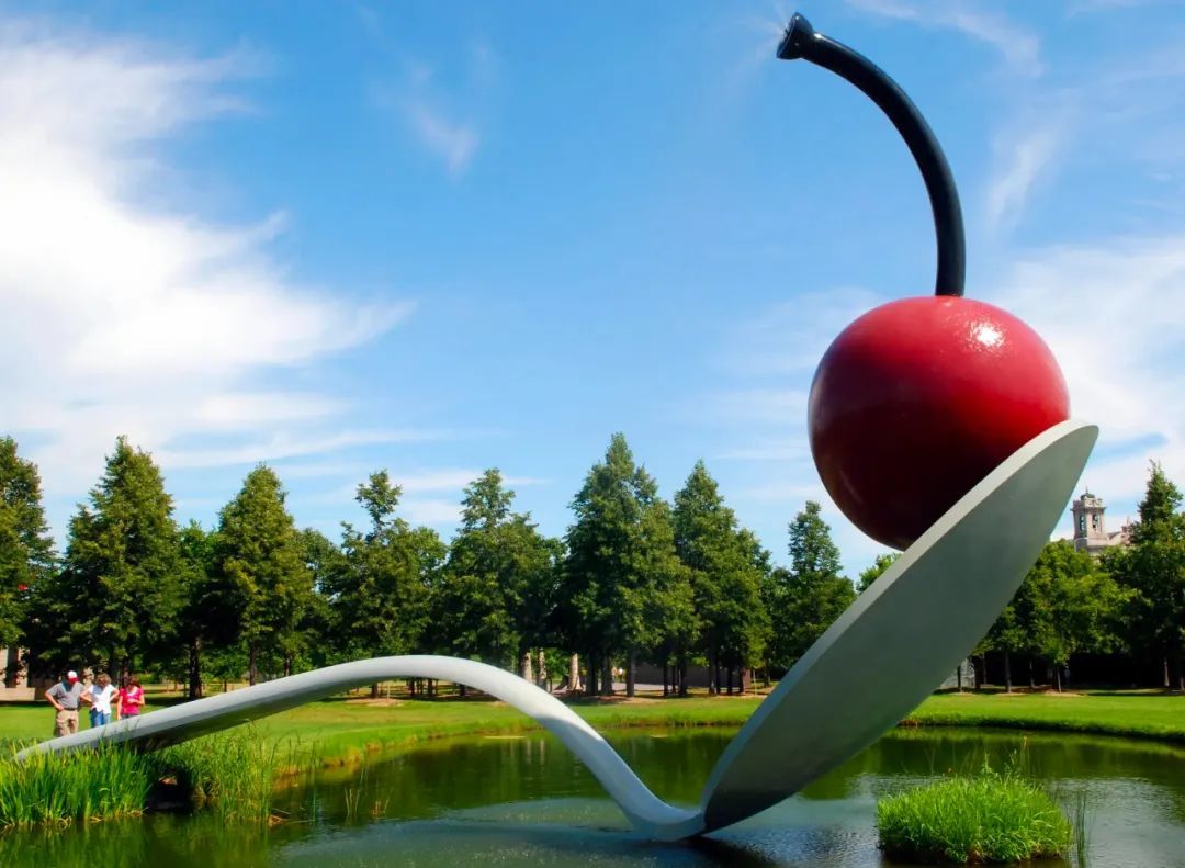 ▲ 艺术家克拉斯·奥登伯格(Claes Oldenburg)与妻子库斯耶·范·布鲁根(Coosje van Bruggen)1988年创作的《勺子桥和樱桃》(Spoonbridge and Cherry);图源美联社