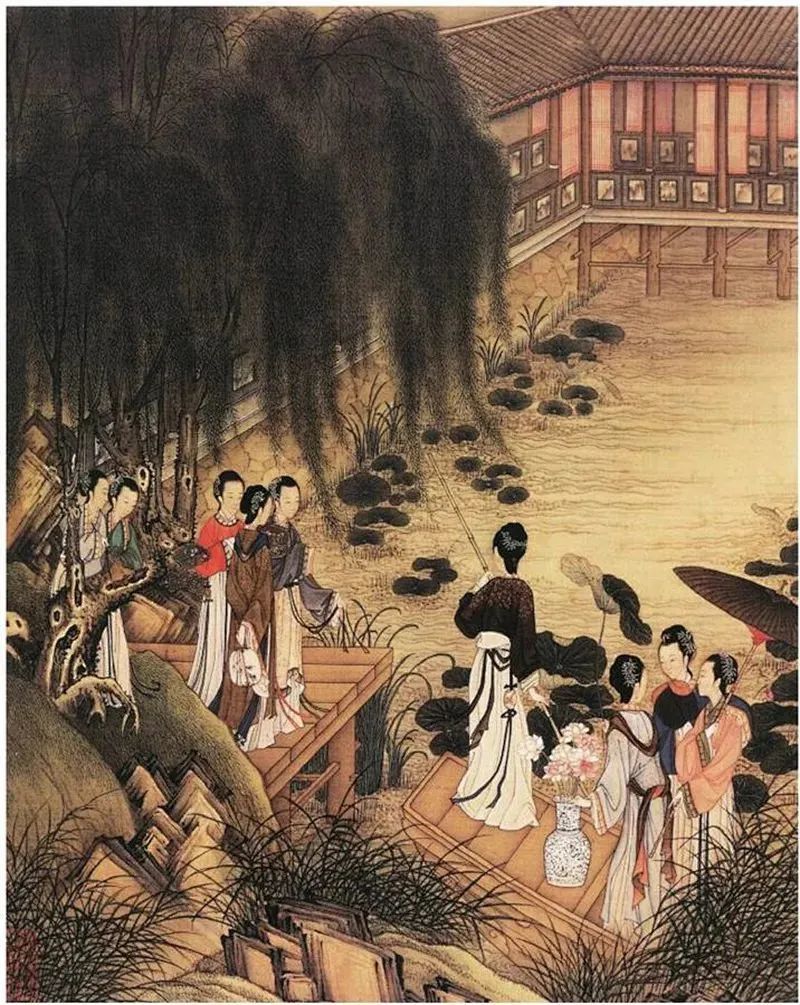 夏日赏荷观莲之俗由来已久,宋代时已是十分流行,盛夏江南,邀朋唤友,荷塘泛舟、纳凉赏景、酒食弹唱,一时成为了最惬意的夏令清赏活动,宋代范成大曾在《吴郡志》中写:“荷花荡在葑门之外。每年六月二十四日,游人最盛,画舫云集,露帏则千花竞笑,举袂则乱云出峡,挥扇则星流月映,闻歌则雷辊涛趋,苏人游冶之盛,至是日而极矣。”