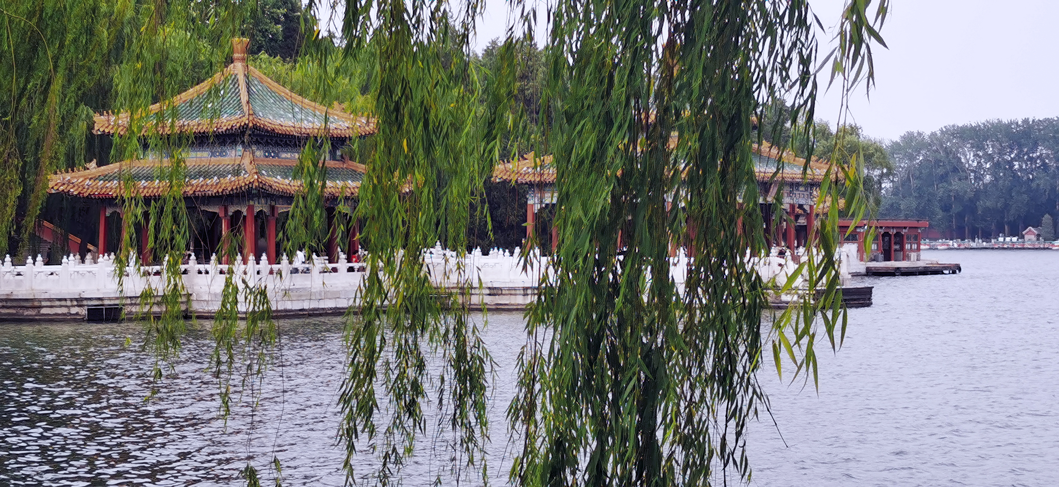 五龙亭,中为龙泽亭,左为涌瑞亭、浮翠亭,右为澄祥亭、滋香亭。原是帝后及近臣垂钓赏月之地,如今是游人眺望白塔及北海湖光山色和休憩的地方。