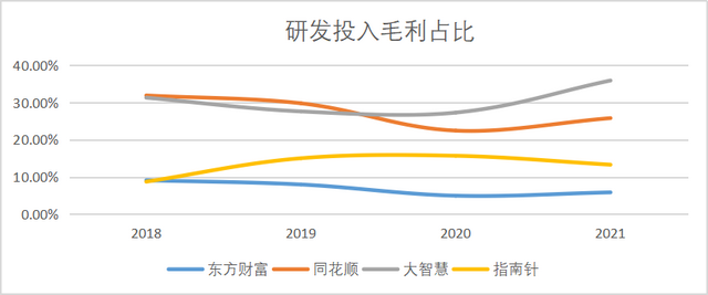 东方财富董事长沈军在电话会中明确表示:“我们是有牌照的技术企业”,并且在多个场合都宣称东方财富是互联网公司。但是我们对比同行业的财经门户软件公司发现,东方财富在研发投入上好像不是那么愿意花钱。2021年报显示东方财富研发投入占毛利比仅为5.82%,而体量更小的同花顺占比达到了25.8%,刚刚取得网信证券牌照的“小东财”指南针,研发投入占比也达到了13.28%。