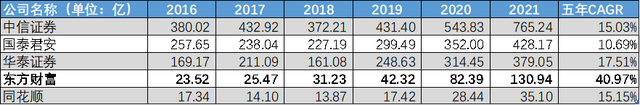 我们统计了券商TOP3(净利规模)和“老对手”同花顺,自16年以来的增长,东方财富的五年CAGR达到了40.97%,远高于同行,21年营收同比增速达到了58.93%。