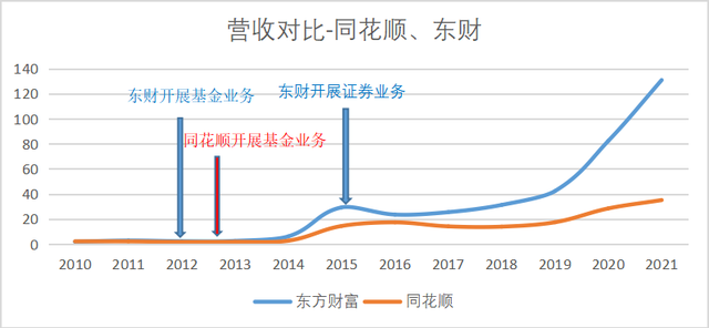 通过财经门户网积累的流量,切入券商赛道,虽然收购同信证券是在2015年以292倍高PE的价格收购,但牌照为东财构建了一条“护城河”,相对于互联网财经门户的同行,拥有牌照等于开辟了第二甚至是第三增长曲线。以目前的市值和营收来看同花顺已经和东财不是一个量级的企业。