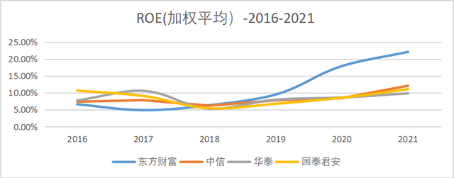 和传统券商相比,东方财富的ROE远高于同行,2021年达到了22.1%。而TOP3行业均值为10.99%,可以看出东方财富的资本使用效率和盈利能力远高于传统券商。