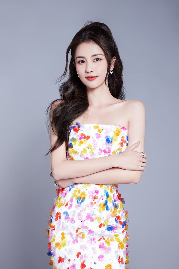 2022年7月14日,欢娱影视发布一组白鹿半扎高马尾、搭配印花抹胸纱裙写真。