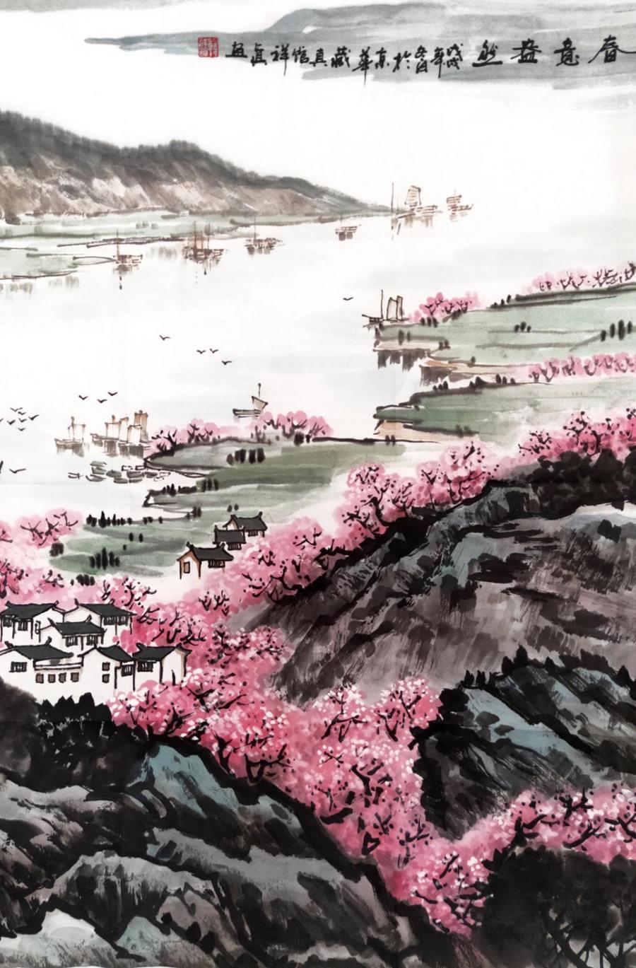 创作意境:春吹桃花吐芽竞先绽放,那被春风簇拥着的人家,有自然界的神灵庇佑,在春雨的润泽下,万物复苏,万物生机勃勃,熬过漫长的冬天,终会迎来万物复苏,生机勃勃的春天。